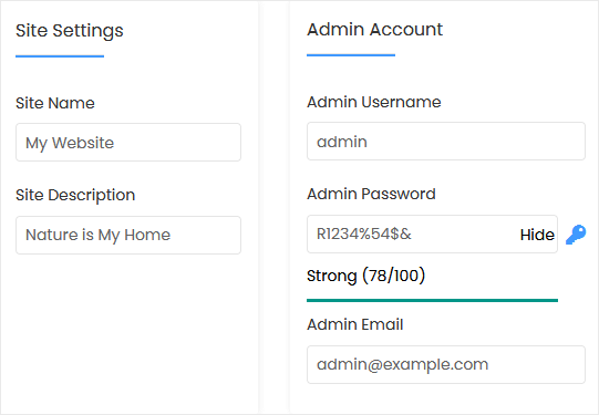 - Admin Username: Your new PopojiCMS username (for security reasons, do not use the administrator or the admin username).