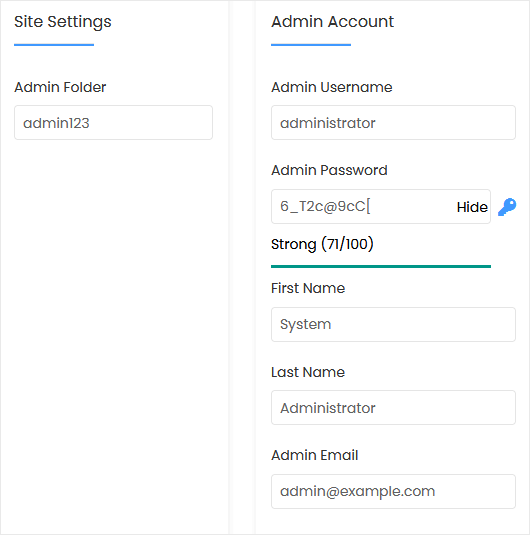 - Admin Username: Your new OctoberCMS username (for security reasons, do not use the administrator or the admin username).